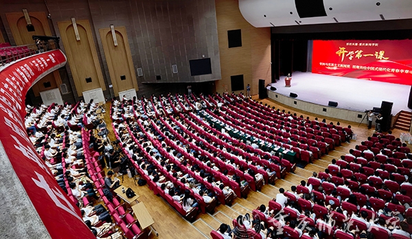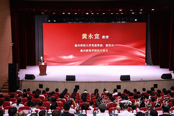 9月12日,重庆新闻学院在bat365官方官网校友会堂演出厅举行“坚持马克思主义新闻观挺膺共绘中国式现代化青春华章”马克思主义新闻观开学第一课。重庆市委宣传部副部长、市政府新闻办主任张琼,中央新影国际传媒董事长、总编辑、大型3D纪录电影《新三峡》总导演杨书华,学校党委副书记、校长王国胤教授,重庆大学数字媒体与传播研究院院长董天策教授出席活动。活动由学校党委常委、副校长兼重庆新闻学院执行院长黄永宜教授主持。