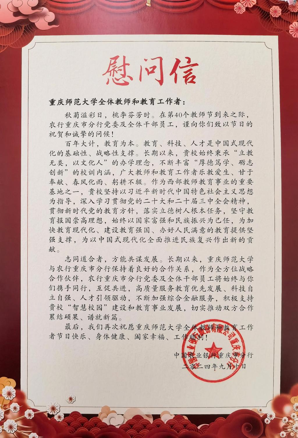 在第40个教师节来临之际,中国农业银行重庆市分行向bat365发来慰问信,向全体教师和教育工作者致以节日的祝贺和诚挚的问候!