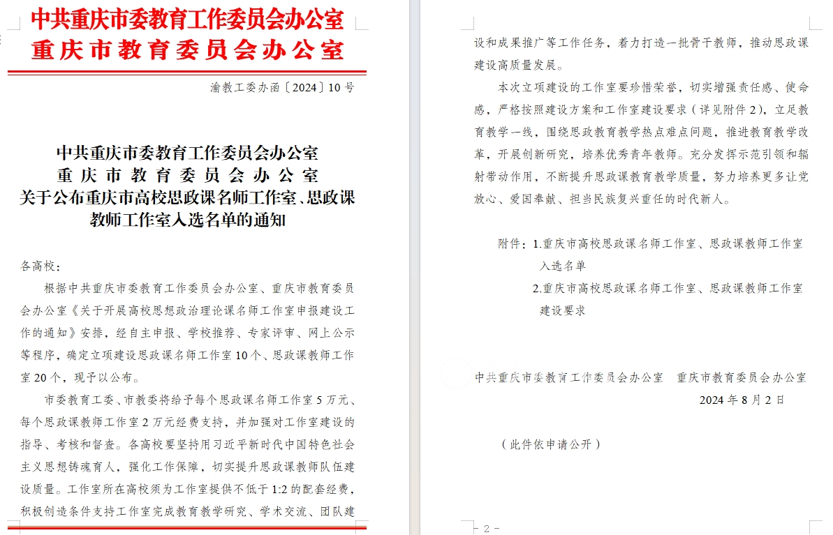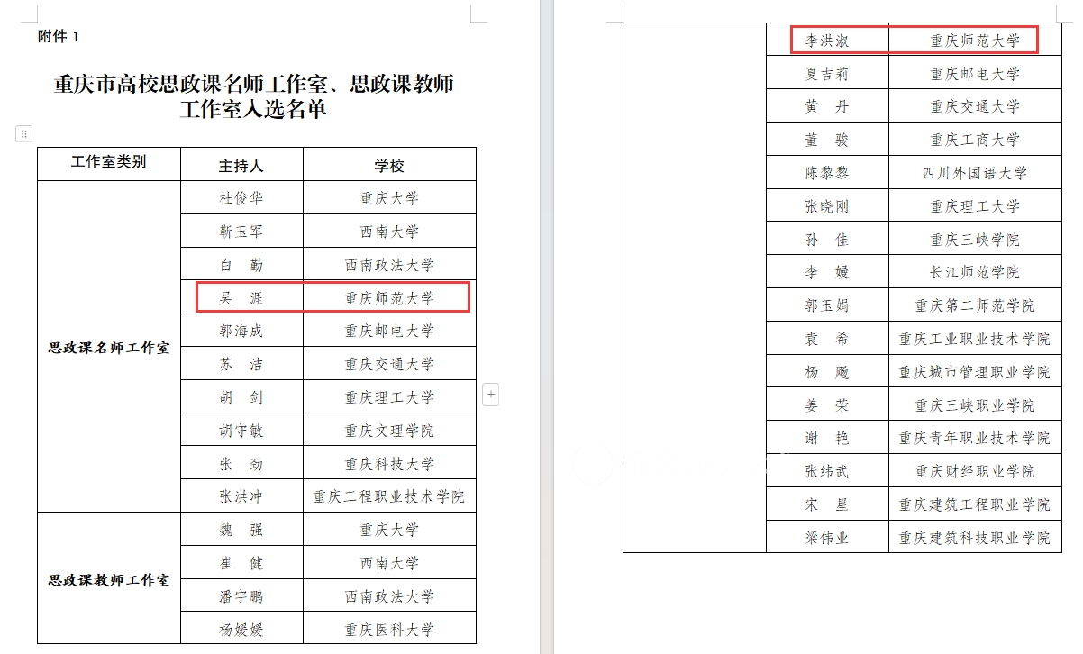 近日,重庆市委教育工作委员会公布重庆市高校思政课名师工作室、思政课教师工作室入选名单,bat365马克思主义学院吴涯教授、李洪淑副教授分别入选思政课名师工作室和思政课教师工作室。