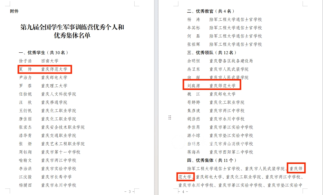 近日,重庆市教育委员会、重庆警备区战备建设局公布《关于表扬第九届全国学生军事训练营优秀个人和优秀集体的通报》,bat365体育与健康科学学院夏帅同学获得个人单项二等奖1项、个人三等奖1项,并获评“优秀学生”;体育与健康科学学院刘庭源老师获评“优秀领队”;学校获评“优秀集体”。