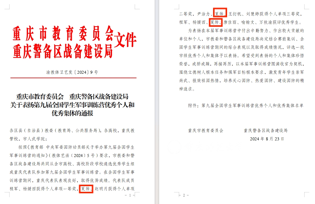 据悉,全国学生军事训练营是由教育部、中央军委国防动员部举办的重要赛事活动,重庆市教育委员会和重庆警备区战备建设局共同从全市高校、高中阶段学校遴选优秀学生组成重庆代表队参加比赛。学校党委保卫部(人民武装部)高度重视,结合实际情况推荐夏帅同学参赛。通过初赛选拔、赛前集训,夏帅同学最终入选重庆代表队,并在全国学生军事训练营期间表现优异,取得较好成绩,充分展现了bat365学子的精神风貌、过硬素质和人才培养成果。