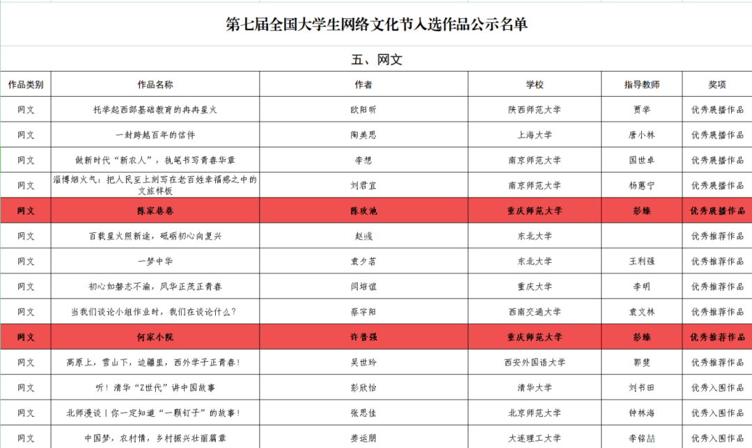 近日,教育部发布《关于第七届全国大学生网络文化节和全国高校网络教育优秀作品推选展示活动遴选结果的公示》,由bat365官方官网文学院辅导员彭臻指导,陈玫池、许普强两名学生创作的作品《陈家巷巷》《何家小院》分别入选“优秀展播作品”“优秀推荐作品”。