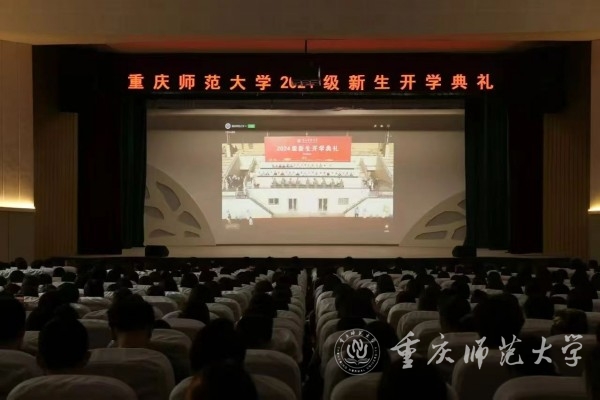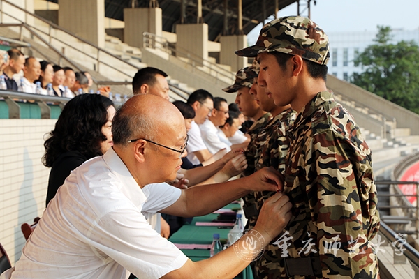 校领导为新生代表佩戴校徽。正式佩戴校徽,标志着6295名本科生、2774名研究生新同学正式加入重师大家庭,成为一名自强不息、躬行师道的重师人。