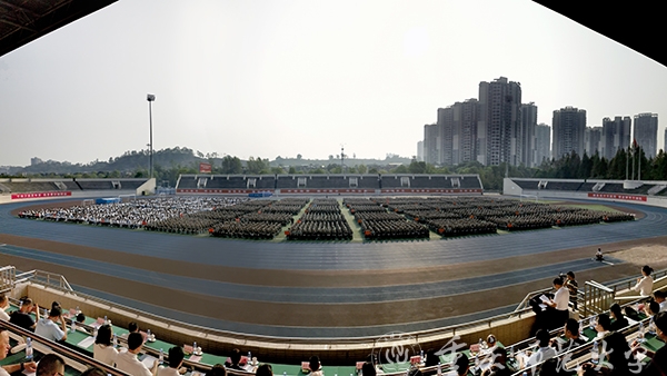全体在家校领导、各二级单位主要负责人、各学院学生工作分管领导,新生年级辅导员、承训部队教官、2024级全体本科生和研究生参加典礼。副校长杨如安主持典礼。