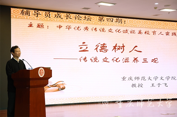 随后,文学院王于飞教授受邀作题为《立德树人——中华优秀传统文化滋养三观》的主旨报告。王于飞首先以《种树郭橐驼传》为引,指出了“树人”的重要性和基本方法,并从中西方文化比较的角度剖析了不同文化背景下世界观、人生观、价值观的形成和差异。他认为,西方观念很大程度影响和改变了现代人对古代文学和传统文化的理解,而理解中国、继承文化、发扬传统,首先就应该回归和坚持中国立场。王于飞指出,高校辅导员要深入挖掘中华优秀传统文化的永久魅力和时代风采,用以培根铸魂、启智润心,引导学生立大志、明大德、成大才、担大任,努力成为堪当民族复兴重任的时代新人。