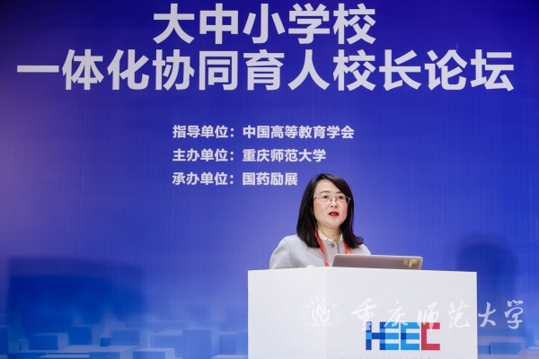 重庆市人民小学党委书记、集团总校长杨浪浪以《系统推进大中小协同,构建高质量育人体系》为题,分享了对大中小一体化协同育人中存在的“育人主体参与性不足、合作浅层化、标准不清晰”等问题的思考。他强调,要坚持大中小思政一体化建设,打通空间场域的全方位利用,贯穿优质师资的全过程培养,形成课程设计的聚合力。