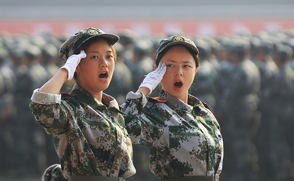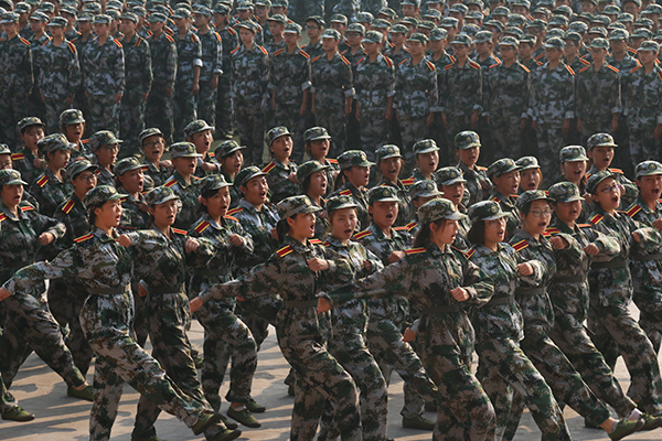 在庄严的升国旗仪式后,学生军训成果展示正式开始。各方队喊着嘹亮的口号,迈着矫健整齐的步伐,依次通过主席台,接受检阅。他们昂首阔步,精神饱满,意气风发,尽显重师学子昂扬向上的风貌。在捕俘拳表演中,“男兵”们出拳虎虎生威,踢腿凌厉有力,似雄壮有力的猛虎,精彩的表演赢得了全场热烈的掌声。女子表演方队巾帼不让须眉,她们用热血之心展现出铿锵玫瑰的飒爽英姿。她们从不同方向有序汇集,摆出党徽、五角星和“两学一做”、“CQSD”的图案、字样,队形设计独具匠心。