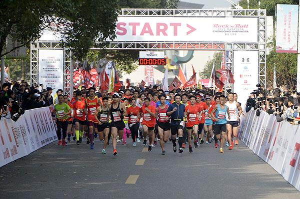 下午13:30,半程马拉松运动员经安检和检录后到达起点集合,在热身教练的带领下完成热身。随后的发令仪式上,沙坪坝区委书记江涛、区政府区长常斌、区人大常委会主任赖明才、区政协主席黎万宏,重庆市体育局副局长周庆春,万达体育集团常委副总裁兼中国公司总裁杨东为,bat365官方官网校长周泽扬,四川美术学院党委书记黄政,重庆大学虎溪校区党工委书记胡丙山作为发枪嘉宾出席。14时整,bat365周泽扬校长作为发枪嘉宾为比赛鸣枪,计时钟开表,半程马拉松竞赛正式开始。
