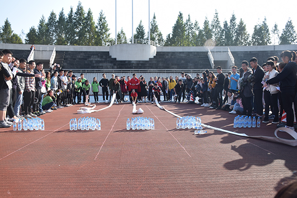 此次活动分为两个部分进行。第一部分为消防疏散演练,由消防人员对和风苑D栋学生公寓参加演练人员进行培训讲解,并实地进行应急疏散演练。第二部分为消防趣味运动会,由学生和教职工代表组成的20支队伍共同参与了“接力灭火”、“连接水带接力”、“水带保龄球”、“穿越火线”四个趣味竞赛项目的角逐。此外,活动现场还特别设置了消防知识有奖问答和消防体验区,让广大师生学习和了解消防知识,零距离接触使用消防器材,掌握日常必备的消防技能。整个活动趣味横生、别开生面,是一次集知识、趣味、体验为一体的创新型师生运动会。通过激烈争夺,经济与管理学院获得一等奖;美术学院和体育与健康科学学院获得二等奖;生命科学学院、计算机与信息科学学院和地理与旅游学院获得三等奖;体育与健康科学学院获优秀组织奖。