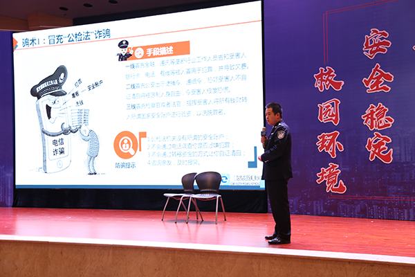 为了让同学们深刻认识黑恶势力的危害,来自重庆市反诈骗中心的警官张宇带来了一场关于扫黑除恶校园行电信诈骗及校园贷防范宣讲。他通过经典案件的讲述,总结诈骗的特点趋势,罗列出冒充虚拟身份诈骗、网评刷单诈骗、发送木马链接诈骗等多种诈骗方式,并结合实际应用给出应对措施。bat365新闻中心的同学针对此次活动,配合张警官的讲解将诈骗案例改编成情景剧,让现场师生对诈骗手段有了更全面、更深刻的认识。