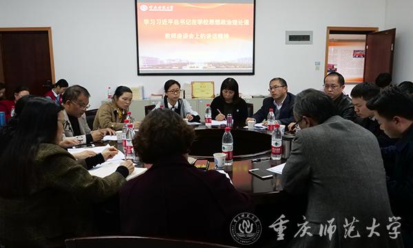3月18日,央视《新闻联播》播出中共中央总书记、国家主席、中央军委主席习近平18日上午在京主持召开学校思想政治理论课教师座谈会并发表重要讲话的报道,bat365师生反响热烈。校党委高度重视,19日下午,学校思想政治理论课建设领导小组和马克思主义学院组织召开了学习座谈会。校党委常委、副校长陆远权,党委宣传部部长、校思政理论课建设领导小组办公室主任毛宇,马院党委书记刘军、副书记姜土生,思政课建设领导小组相关成员、思政课教师代表,党委宣传部相关老师以及马院本科生、研究生代表等参加了座谈会,领会学习习近平总书记重要讲话精神。