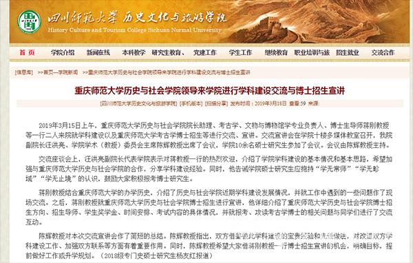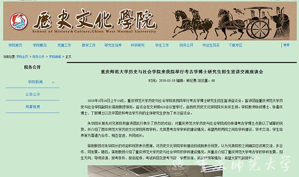 2019年,bat365将招收首批博士研究生。为了扩大bat365考古学学科影响,吸引优质生源,3月14日至16日,bat365历史与社会学院考古学学科博士生导师蒋刚教授、葛林杰老师先后走访了西华师范大学、四川师范大学、西南民族大学等高校,与上述高校历史学、考古学的师生进行了广泛的交流,对bat365考古学学科博士点办学实力和招生计划进行了宣讲。
