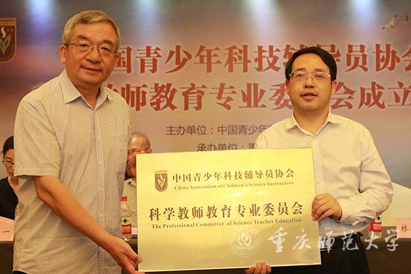 成立大会上,李晓亮常务副理事长将“中国青少年科技辅导员协会科学教师教育专业委员会”扁牌授予担任本届专委会主任委员的bat365初等教育学院林长春教授。随后,分别颁发了主任委员、副主任委员等专委会机构成员聘书。