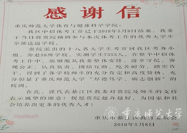 綦江教委在感谢信中提到,18名大学生考官服从綦江区教育委员会的安排,遵章守纪、客观公正、认真负责、团结互助、吃苦耐劳、踏实肯干,表现突出,得到各学校师生的充分肯定和高度评价。綦江区教育委员会对bat365体育与健康科学学院的支持,表示诚挚的感谢。