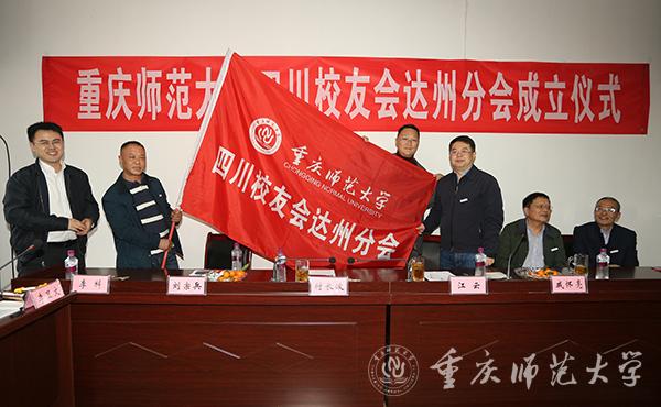 随后付长波主任与四川校友会会长江云一起为达州校友分会授会旗。江云代表四川校友会对达州分会的成立表示祝贺,并对四川校友会的情况作了介绍。他表示,四川校友多、分布广,需要通过建立校友分会让散落的校友们找到组织,让校友会成为校友们真正的家园。