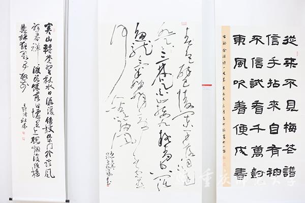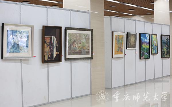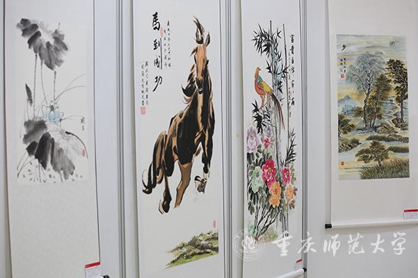 本次作品展分为在职教师与学生组和离退休组两个展区。观展过程中,校领导与师生、离退休老同志亲切交流。由退休教师邓正平创作的《石门大桥》以传统画法描绘了重庆改革开放以来不断变革的建筑文化,记录了重庆的发展脉络;bat365美术学院学生秦源茂、任丽莅创作的《多极码》以新颖的二维码图式呈现出中国地图的形状,既将中国文化元素融入其中,又富有时代气息。丹青之色尽现情怀,不论是传统技法还是现代立意,都使重师人对学校、对重庆、对国家的深情与热爱跃然纸上。