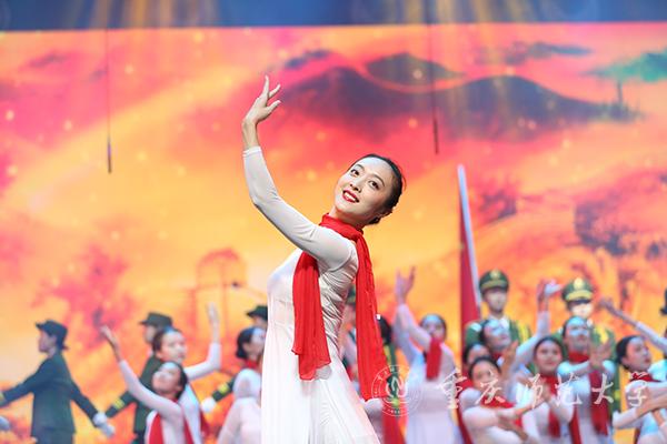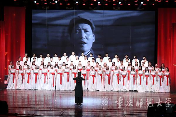 “东方红,太阳升,中国出了个毛泽东……”音乐学院丝路合唱团带来《东方红》,新闻中心与重师附属小学的学生合作情景表演唱《没有共产党就没有新中国》表达出人民群众对党的深情;朗诵《谁是最可爱的人》凸显了朝鲜战争中战士们浴血奋战的英雄精神。国歌奏响于这两个节目之间,巧妙地融入剧情。在场人员全体肃立,高歌唱响爱国情;舞蹈《沿着社会主义大道奔前方》以百姓“丰收”之喜描述了中国人民跟着党走社会主义道路所收获的美好生活。