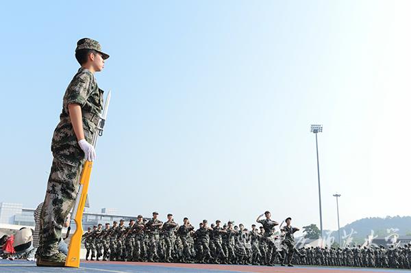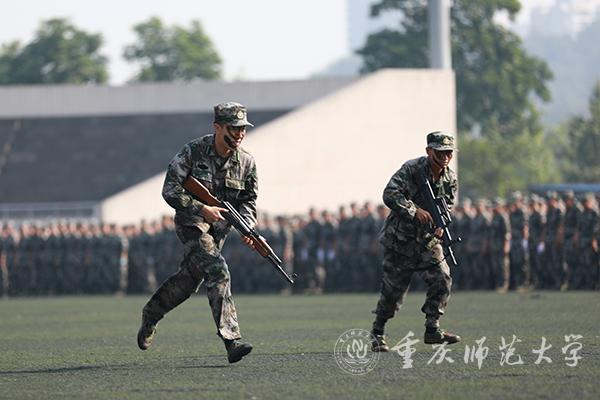 踏着雄壮激昂的《分列式进行曲》,各个方阵迈着铿锵有力的步伐依次经过主席台接受检阅,他们身着绿色的迷彩服,意气风发;他们踏着坚定的步伐,大步向前。女子军体拳表演拳风飒飒,展现出巾帼不让须眉的豪情;男子捕俘刀方队手持匕首,刺出、收回,动作迅速利落,举手投足间彰显男儿血性;立正、稍息、敬礼……列队方队表演整齐规范,刚健有力;内务整理与演习表演令人耳目一新,奔跑、翻滚、匍匐前进,展示了新生良好的精神风貌,赢得在场师生的阵阵掌声。