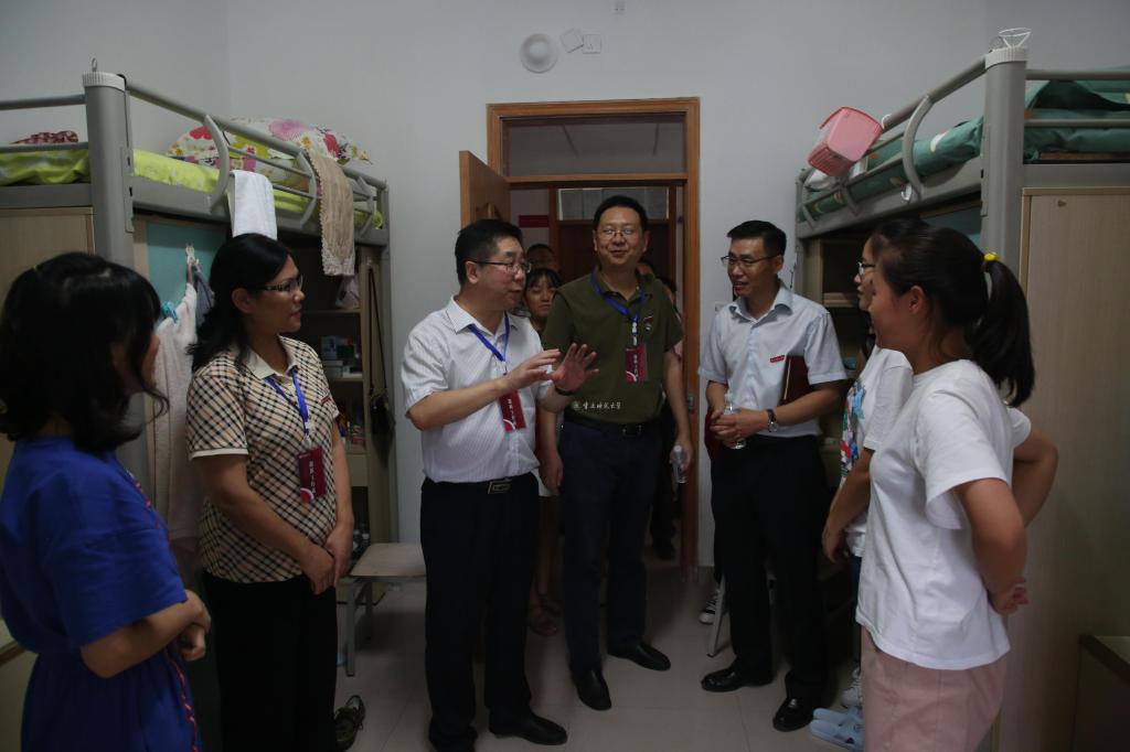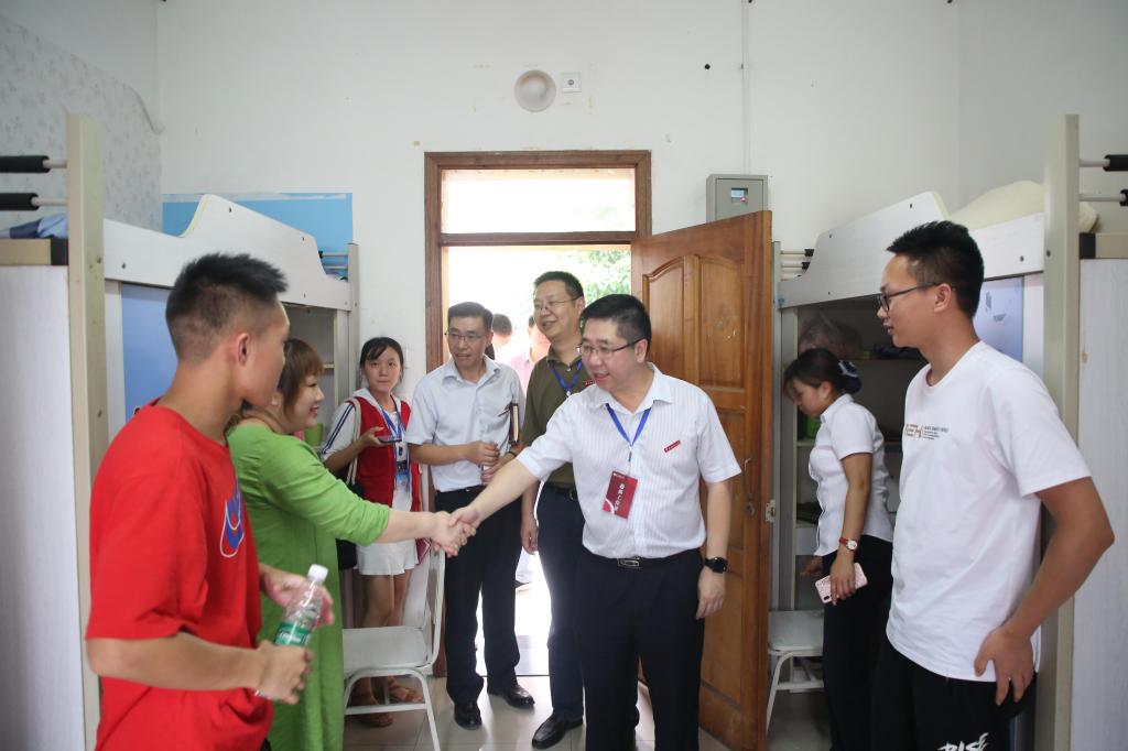 下午,孟东方校长、龚燕副书记、田盈副校长一行再次看望慰问迎新点,并专门来到新生宿舍看望已经报到的新生,与学生和家长亲切交谈。