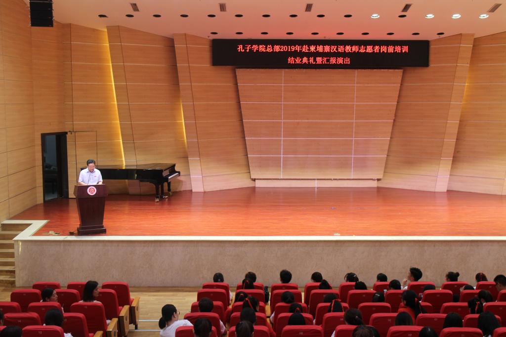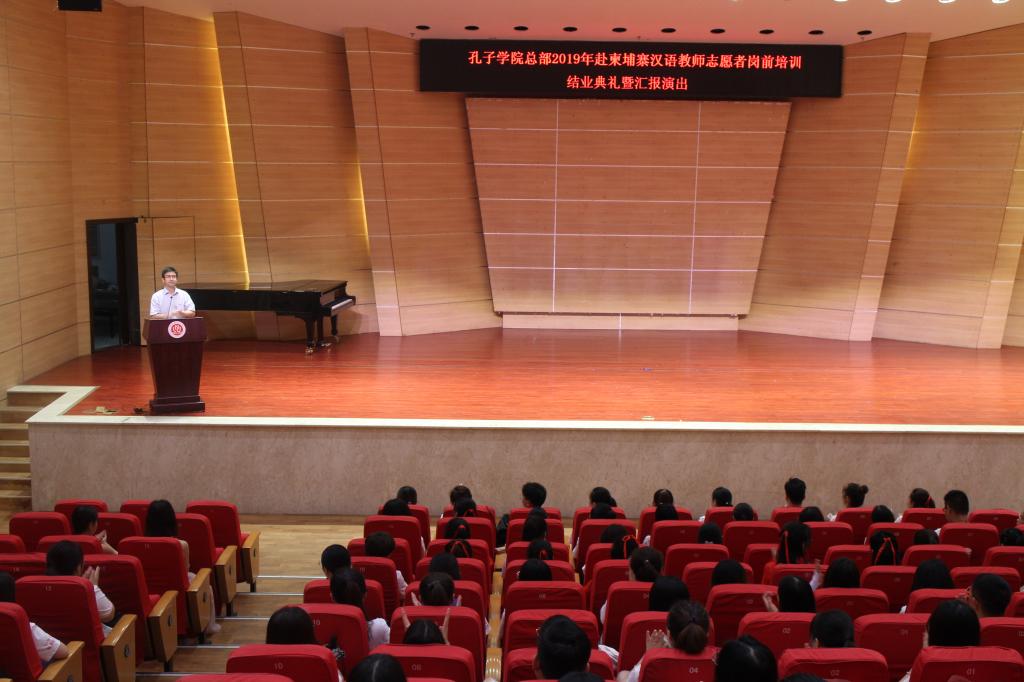 7月30日上午,“孔子学院总部2019年赴柬埔寨汉语教师志愿者岗前培训”结业典礼在bat365校友会堂音乐厅举行。副校长陆远权出席并致辞。结业典礼由国际汉语文化学院院长雷勇主持。赴柬埔寨汉语教师志愿者全体学员和国际汉语文化学院工作人员参加了典礼。