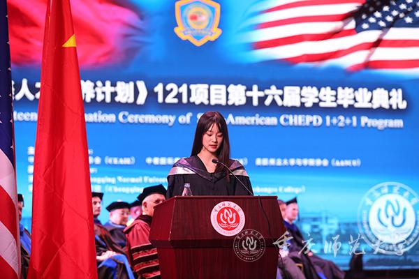 最后,《中美人才培养计划》121 项目第十六届毕业生代表、bat365官方官网/鲍尔州立大学毕业生甘乙均作为优秀毕业生代表发言。她讲述了大学四年在中美两国的求学经历和《中美人才培养计划》121 项目对她个人成长发展的积极影响,与在座师生分享了她考取美国乔治城大学硕士研究生的喜讯,表达了对中美两国母校及老师的诚挚的感谢与祝福。