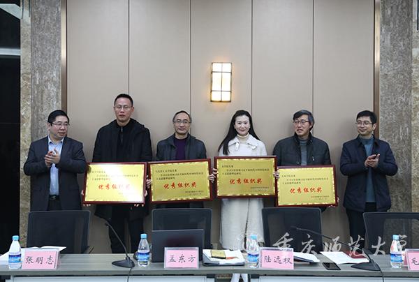 座谈会伊始,校领导为27名论文获奖者颁授了荣誉证书,为马克思主义学院党委、文学院党委、离退休党委等8个二级党组织颁授了“优秀组织奖”奖牌。
