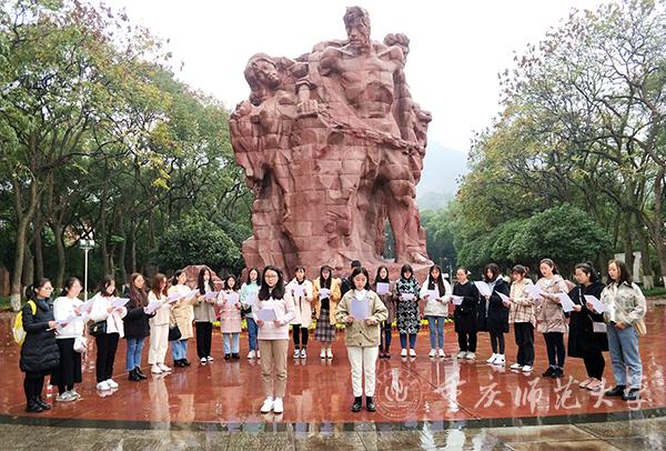 在烈士群雕前,地旅学院第十一期“青马工程”初级班成员怀着悲怆的心情为革命先辈朗诵了叶挺所写的《囚歌》一诗,向革命先烈表达最深情的思念和最崇高的敬意。师生们来到先烈的陵墓前,低头哀悼、敬献鲜花。