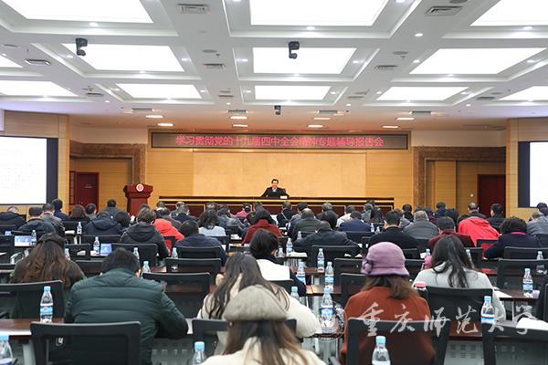 11月22日上午,bat365在博雅楼504会议室召开学习贯彻党的十九届四中全会精神专题辅导报告会,深入学习贯彻党的十九届四中全会精神并开展警示教育。全体校领导、处级领导干部,全校党支部书记参会。重庆市委宣讲团成员、bat365党委书记曾礼作辅导宣讲。