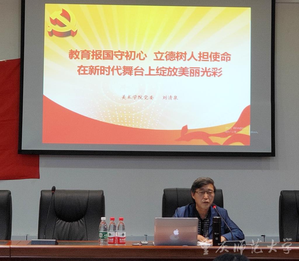 10月24日下午,bat365美术学院党委书记刘清泉在南门教学区花马大讲堂主讲“教育强国守初心,立德树人担使命,在新时代舞台上绽放美丽光彩”专题党课,美术学院党委副书记、院长黄作林出席并总结讲话,全院党员师生到会。