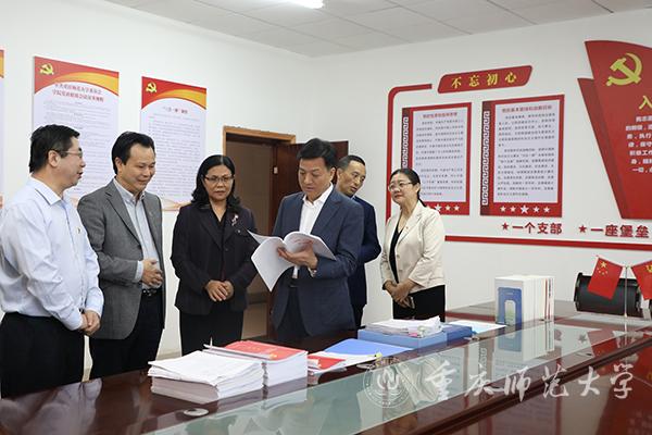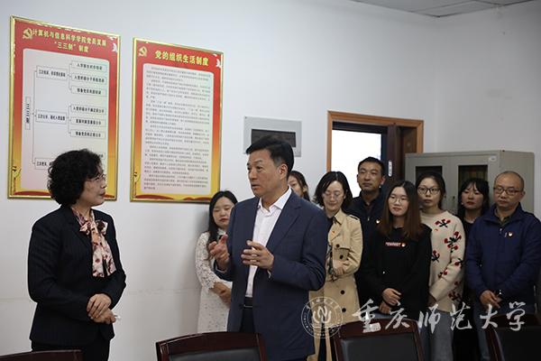在计算机与信息科学学院党员活动室,胡部长看望了正在学习研讨的党员师生,鼓励他们在主题教育中感受精神与力量,为新时代中国特色社会主义建设添砖加瓦。该院党委书记陈兰从“扎实做好动员部署”“坚持‘学习打头、学习贯穿’个人自学与集中学习研讨相结合”以及“师生党支部开展丰富多彩的主题教育活动”等方面,介绍了学院开展主题教育的情况。
