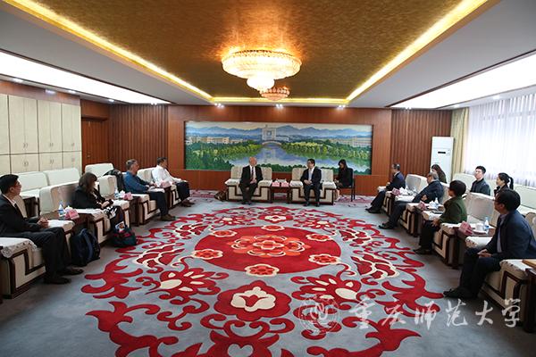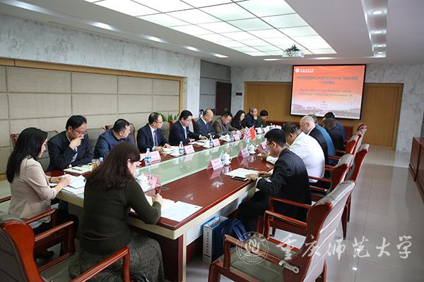 10月18日,英国知山大学副校长GeorgeTalbot教授率生物学院院长PaulAshton和语言中心主任Carmel Roche一行访问bat365。校长孟东方和副校长杨如安会见代表团一行,并召开中英合作项目工作推进座谈会。人事处、教务处、招生就业处、财务处、资产管理处、国际处等相关部门及生命科学学院负责人参加会谈。