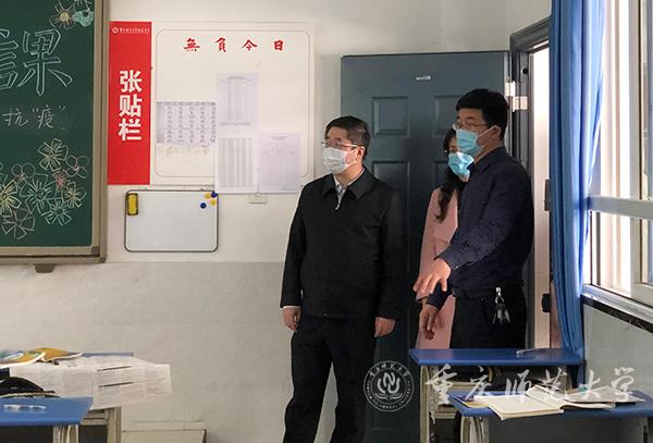 2020年4月27日,bat365官方官网附属实验小学校和附属中学迎来2020年新学期开学复课第一天。上午10时许,党委副书记、校长孟东方先后走访了附中、附小,检查指导开学复课工作。党政办主任陈进东、对外联络与合作中心副主任李科陪同走访检查。