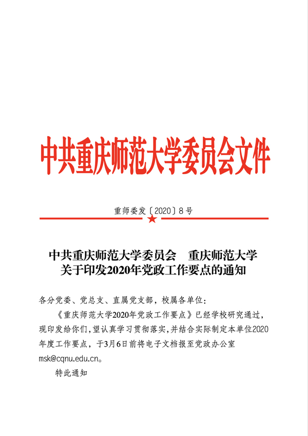 为整体推进学校全年工作,学校按照校历安排,在各部门提出的基础上,多次征求各单位和学校班子成员的意见,经党委常委会、校长办公会研究同意,于2月27日印发了《bat365官方官网2020年党政工作要点》。党政工作要点从坚决打赢疫情防控阻击战、持续推进全面从严治党、抓实抓好本科教育、促进学科人才科研联动、打造“名生名师名气”的文化特质、拓宽拓深工作领域、改善学习工作环境、强化师生全员参与等八个方面,提出年度40项工作任务。《工作要点》印发后,各位校领导分别对分管部门和联系学院,通过各种小型会议、网上会议、电话联系等多种方式,就落实好工作要点进行了布置和安排。目前,各单位正按照学校党政工作要点精神,拟定本单位年度工作要点;并按照学校“1+4”五年行动计划目标任务责任分解方案,梳理各单位2020年度目标任务责任书。