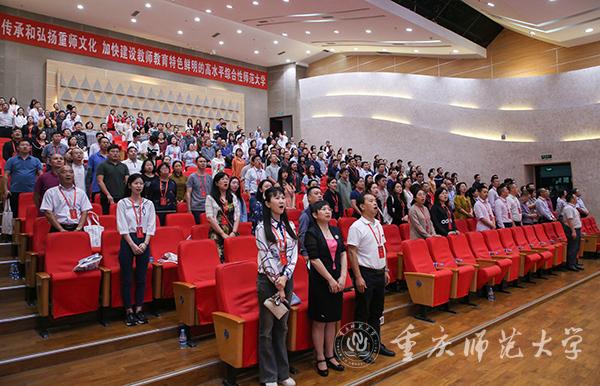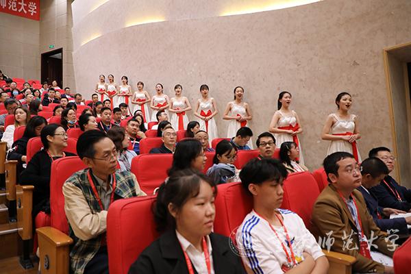 “一条大河波浪宽,风吹稻花香两岸……”bat365音乐学院学生唱着深情悠扬的歌声从两侧缓缓步入会场,全场齐唱国歌后,大会拉开帷幕。全体人员共同观看bat365官方官网文化形象宣传片《重师文化滴翠》,该片展示了学校文化建设取得的可喜成绩,展现了全体重师人良好的精神风貌,彰显了浓厚的重师情怀。