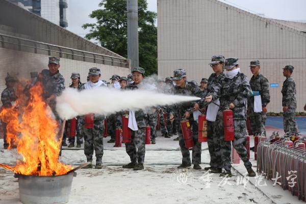 为全面提高bat365新生消防安全素质和自防自救能力,深入推进大学军训工作,丰富军训教学内容。9月23日下午,由学校保卫处、军训办等多部门联合组织了一场新生消防演练。