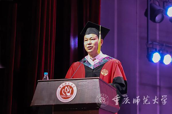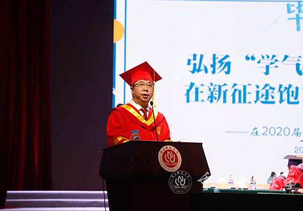 校长孟东方代表学校做了题为《弘扬“学气”,勤耕不辍 在新征途饱览人生美丽风景》的讲话。他说,“初入重师,你们青涩懵懂、稚气未脱;学在重师,你们积累知识、拼搏耕耘;即将离开重师,你们意气风发、踌躇满志。”真诚地祝贺2020届1177名毕业研究生与6333名本科毕业生在重师丰富了知识、锤炼了技能、收获了成熟。