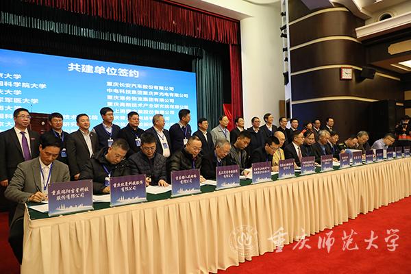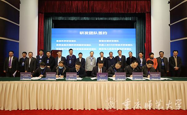 会上,重庆国家应用数学中心与北京大学、中国科学院大学、中国科学院绿色智能技术研究院、重庆大学、陆军军医大学、西南大学、重庆长安汽车股份有限公司、中国电科重庆声光电有限公司、重庆港务物流集团有限公司、重庆市高新技术产业研究院有限责任公司、北京大学重庆大数据研究院、重庆攸亮科技股份有限公司、马上消费金融股份有限公司、重庆瑞阳吉星科技股份有限公司、重庆猪八戒网络有限公司、重庆材料研究院有限公司等16家共建单位签订了合作框架协议,与智能交通研发团队、机器人与3D打印技术、信息科学、复杂电力系统可靠性、消费金融关键科学问题、新能源汽车高效热管理系统等6个研发团队代表签订了项目研发合作协议。