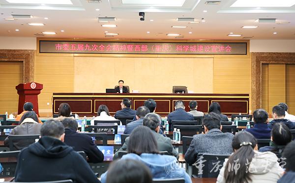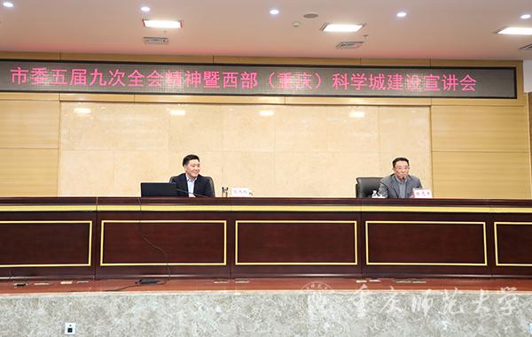 在全市上下深入学习重庆市第五届委员会第九次全体会议精神的背景下,为贯彻落实总书记对重庆提出的系列重要讲话精神,切实推进西部(重庆)科学城建设,12月4日,bat365在博雅楼504会议室举行“学习市委五届九次全会精神暨西部(重庆)科学城建设宣讲会”,主讲人为重庆高新区党工委委员、管委会副主任高久鹏,全体在家校领导、副处级以上干部以及师生代表参加会议,宣讲会由bat365党委副书记陈志军主持。