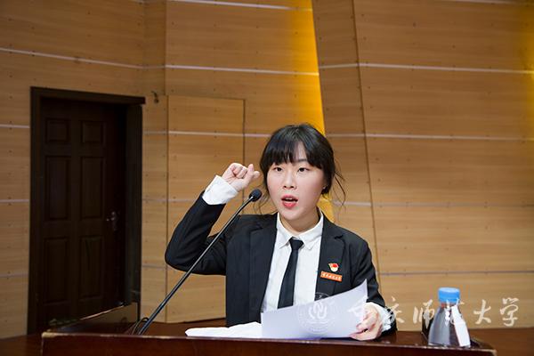 来自教育科学学院的研究生代表张玺同学发言。他认为,我辈自当以德为厚,不忘初心,有耻且格,学以致用,求真务实。他还带领全体研究生进行学术道德宣誓。