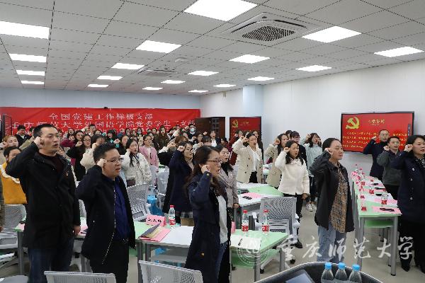 3月25日,全国党建工作样板支部、外国语学院学生第三支部“1314跟党走,青春献礼100年”党史学习教育在集贤楼438室正式启动。启动仪式上,学院党委副书记钟敏带领全体与会党员重温入党誓词,青年党员们“花样”学党史,“走新”更走心。bat365先进事迹报告团成员彭小玲宣讲优秀党员事迹,分享青年学生在党组织引领下的成长经历;青年党员李岳泽雨通过图片对比“两个辛丑年”,声情并茂地展现了中国跨越120年的沧桑巨变;学生三、四支部党员同志双语朗诵红色经典,慷慨激昂的中文朗诵伴随标准流利的英文诵读,让红色党史在中英双语的诠释下迸发出全新的活力。