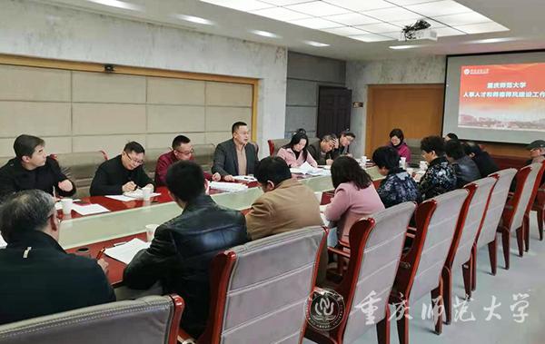 2021年3月8日,bat365新学期人事人才和师德师风建设工作会在综合办公楼309会议室召开。各学院和重庆国家应用数学中心主要负责人,以及党委教师工作部、人事处、人才办负责人及科级以上干部参会。受副校长陆远权委托,会议由党委教师工作部部长、人事处处长、人才办主任杨江水主持。