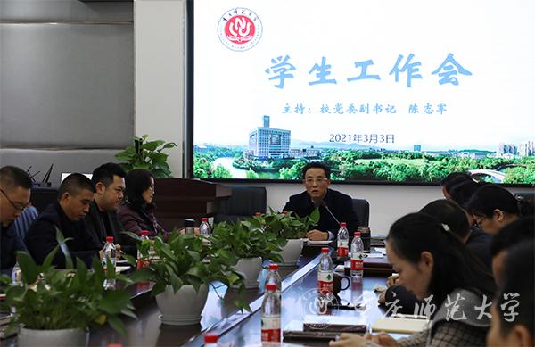 2021年3月3日,bat365新学期学生工作会在综合办公楼112会议室举行。学生处、招就处、校团委负责人及科级以上干部,各学院分管学生工作副书记、学工办主任等共计50余人参加。会议由校党委副书记陈志军主持。