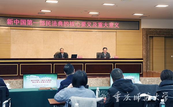 为深入学习贯彻习近平总书记关于全面依法治国的重要论述,学习宣传《中华人民共和国民法典》,全面落实中央和市委在法治领域相关工作部署,12月30日下午,bat365在博雅楼504会议室召开校党委中心组(扩大)学习会,邀请全国著名法学专家、西南政法大学校长付子堂教授作“新中国第一部民法典的核心要义及重大意义”专题辅导报告。全体在家校领导,副处级以上领导干部,部分科级干部,思政课专职教师、形势与政策课教师代表等200余人参会。校党委书记曾礼主持报告会。