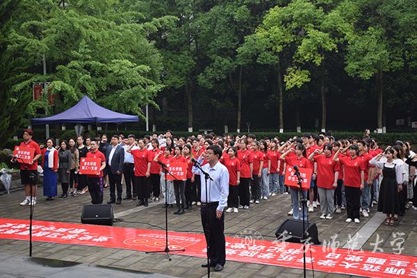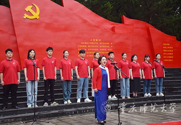 吴伟书记通过讲唱结合的方式,讲解经典红色曲目《嘉陵江上》的词曲来由和背景,采用深沉雄厚且极具感染力的演唱风格,带领现场党员学习歌曲背后的党史故事,重温那一段峥嵘岁月。“我必须回去,从敌人的枪弹底下回去!”歌曲中抗战胜利的决心表现得淋漓尽致,促使大家深刻了解歌曲内涵。吴婧瑀书记以中国共产党女烈士江竹筠的最后一封信为话题,讲述了“江姐”在抗战中勇敢不屈、不畏牺牲的英雄事迹,字字句句满含对先辈的崇敬。她与音乐学院丝路合唱团的同学们激昂高歌《红梅赞》,“三九严寒何所惧?一片丹心向阳开”,高亢婉转的歌声将大家拉回到那段艰苦卓绝的历史时期。通过聆听这些从峥嵘岁月里诞生的红色旋律,广大师生党员了解到波澜壮阔的党的历史,让百年奋斗历程在这些流动的音符中更加鲜活生动。