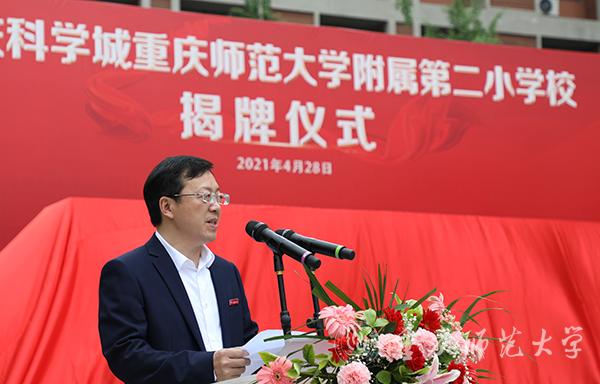 揭牌仪式上,副校长孟小军向来宾致辞。他表示,在bat365官方官网基础教育研究院的指导下,把重师附二小建设成为bat365官方官网附属学校优质品牌学校指日可待。
