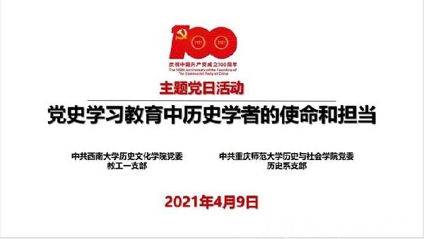 为深入贯彻习近平总书记在党史学习教育动员大会上的讲话精神,进一步增强党员历史学者在党史学习教育中的责任感与使命感,4月9日下午,中共bat365官方官网历史与社会学院历史系党支部与中共西南大学历史文化学院党委教工一支部近40名党员教师齐聚bat365官方官网,联合举办“党史学习教育中历史学者的使命和担当”主题党日活动。
