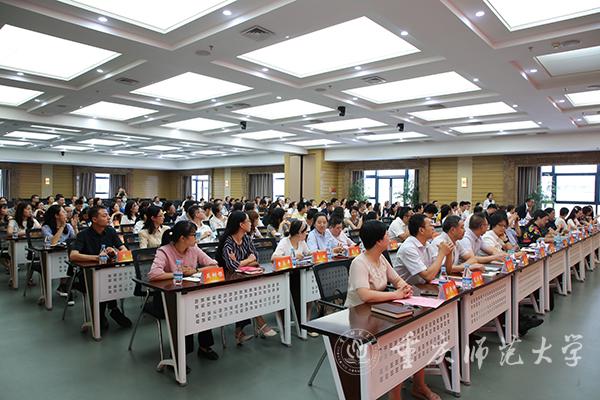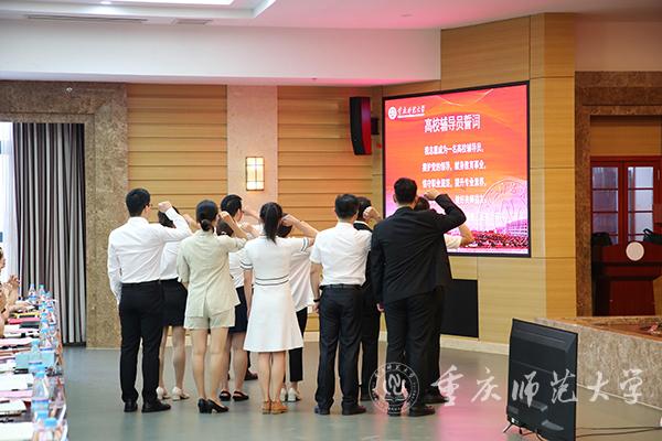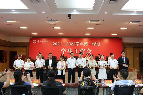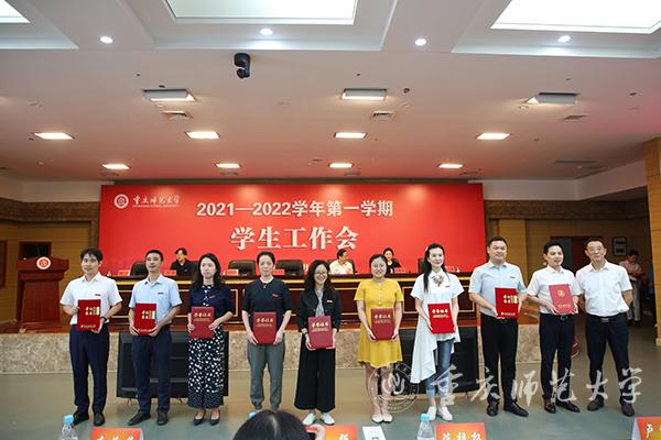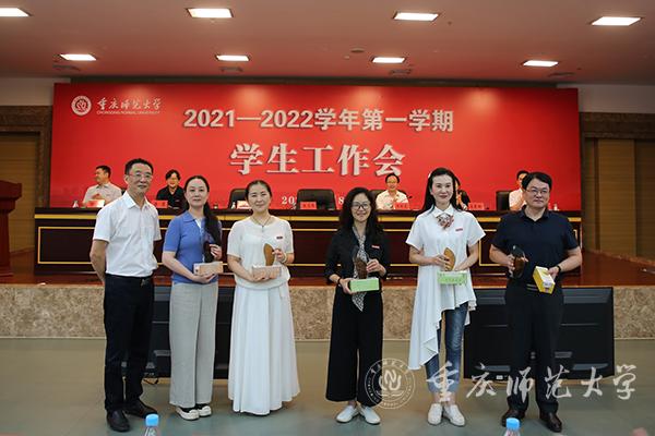 会议分两个阶段进行,第一阶段为2021年新进辅导员入职仪式暨学生工作先进个人系列表彰。第一阶段由学工部副部长、学生处副处长蒋霞主持。首先,团委书记高菁励介绍新进辅导员,共10名今年第一批入职的辅导员在学工部副部长、学生处副处长胡小强领誓下,庄严宣读“高校辅导员誓词”;党委副书记陈志军为新进辅导员颁发入职纪念牌并合影留念。接下来,招生就业处处长党亚莲、副处长田力分别宣读了2020-2021学年获得学生工作奖励的名单;陈志军副书记为获得市级及全国性学生工作奖励的老师颁发获奖证书并合影留念;获奖代表地理与旅游学院学工办主任瞿聪以“辅导员YYDS”为题,表示成为重师辅导员是一件很骄傲和幸福的事情。接下来,学工部部长、学生处处长侯明志宣读了学生工作满20年及以上人员名单,陈志军副书记为他们颁发纪念奖牌和纪念品;外国语学院党委副书记钟敏作为代表分享了她对23年辅导员生涯的理解。会议第一阶段最后,由教育科学学院党委副书记李林霖代表学校2021年暑期学生工作业务培训参培学员以《不忘教育初心,牢记育人使命》为题作交流发言,分享了培训的心得体会,表明从事辅导员工作是一项有意义、有前途、有格局的工作。