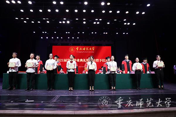 校学位评定委员会副主席、副校长董景荣教授宣读《bat365官方官网学位委员会授位决定》。在庄重的乐曲声中,校领导为研究生、本科生代表一一授予学位,并颁发学位证书,一起合影留念,大家共同见证2021届毕业生的高光时刻。