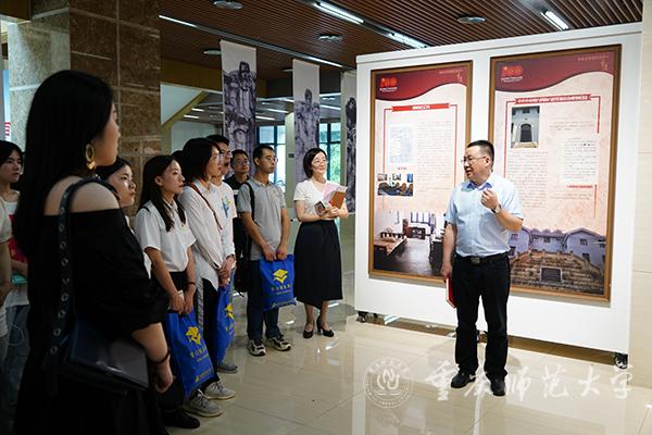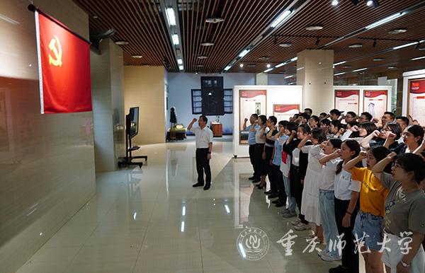 活动第一阶段,毕业生党员在博雅楼一楼大厅参观《革命文物里的党史·重庆》主题展览。在此期间,陈洪教授为毕业生党员生动地讲解了革命文物背后的党史故事。侯明志部长带领毕业生党员在党旗下重温入党誓词。