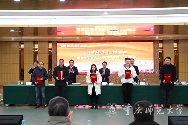 孟东方代表学校宣读表彰决定,同领导们一起为马克思主义学院党委、教育科学学院党委、美术学院党委、新闻与传媒学院党委、初等教育学院党委颁发优秀组织奖,向全体论文获奖者颁发了一二三等奖。